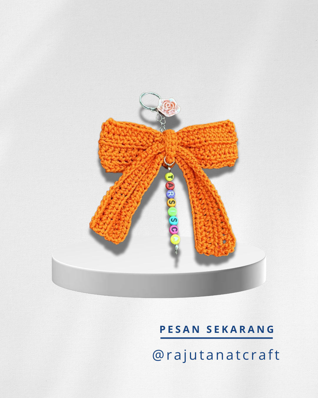 Gantungan kunci rajut berbentuk pita dengan detail manik-manik huruf berwarna-warni. Dibuat secara handmade dengan rajutan rapi sehingga tampil unik, lucu, dan estetik. Cocok untuk mempercantik kunci, tas, maupun dijadikan hadiah.